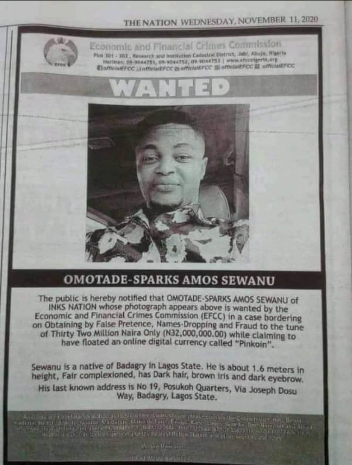 “The Public is hereby notified that Omotade-Sparks Amos Sewanu of Inksnation whose photograph appears above is wanted by the Economic and Financial Crimes Commission EFCC in a case bordering on obtaining by false pretense, names Dropping and Fraud to the tune of thirty Two million Naira Only (32,000,000) while claiming to have floated an online digital currency called “Pinkoin.”