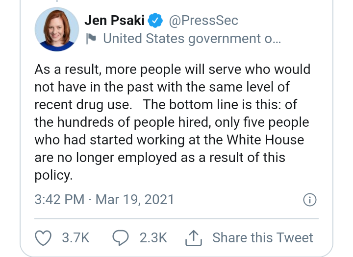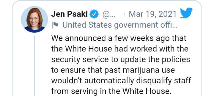 Psaki, in a series of tweets Friday, explained that a few weeks ago “the White House had worked with the security service to update the policies to ensure that past marijuana use wouldn’t automatically disqualify staff from serving in the White House.”