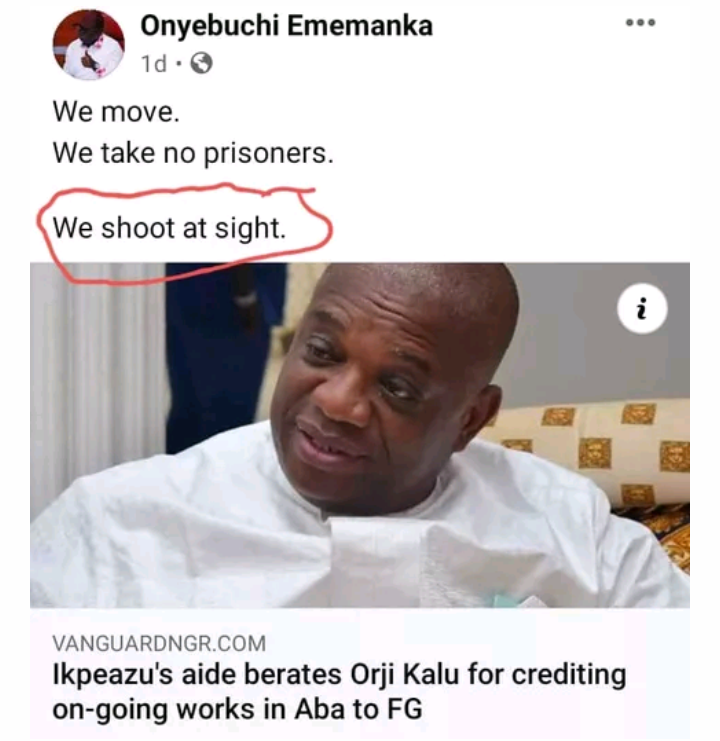 In a post made by the Chief Press Secretary to Abia state Governor, Onyebuchi Ememanka on Facebook and widely shared on the WhatsApp groups of the Governor’s aides , Ememanka said they will shoot Kalu on sight .