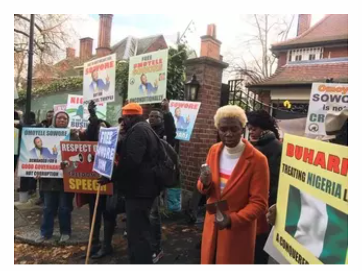 Some Nigerians have gone to the Nigeria House in London to protest against the presence of President Muhammadu Buhari in the country.