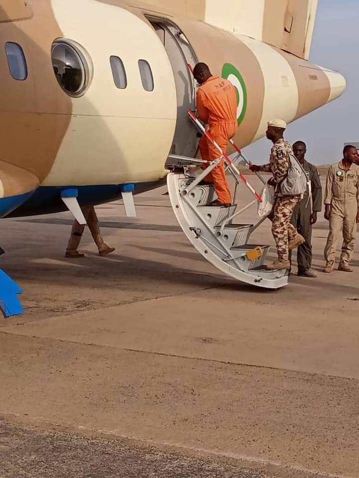 The accused was conveyed in an Airforce military plane from Yola to the Academy, Kaduna for further interrogation.