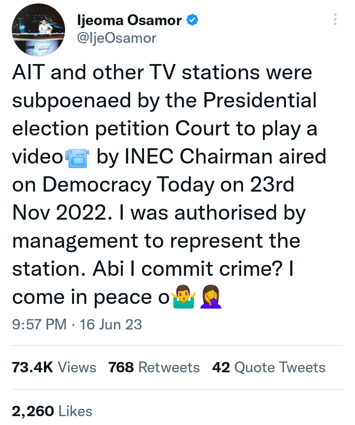 In her twitter post, Mrs. Ijeoma Osamor noted that African Independent Television, AIT and other TV stations were subpoenaed by the Presidential election petition Court to play a video by INEC Chairman aired on Democracy Today, on 23rd Nov 2022. She added that she was authorised by the management of AIT to represent the television station, asking if she committed any crime by honouring the authority of the management of AIT.